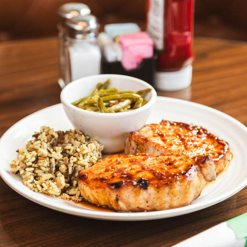 Grilled boneless pork chops marinated in a soy, roasted sesame oil, and rice wine vinegar marinade served with 2 (two) sides.