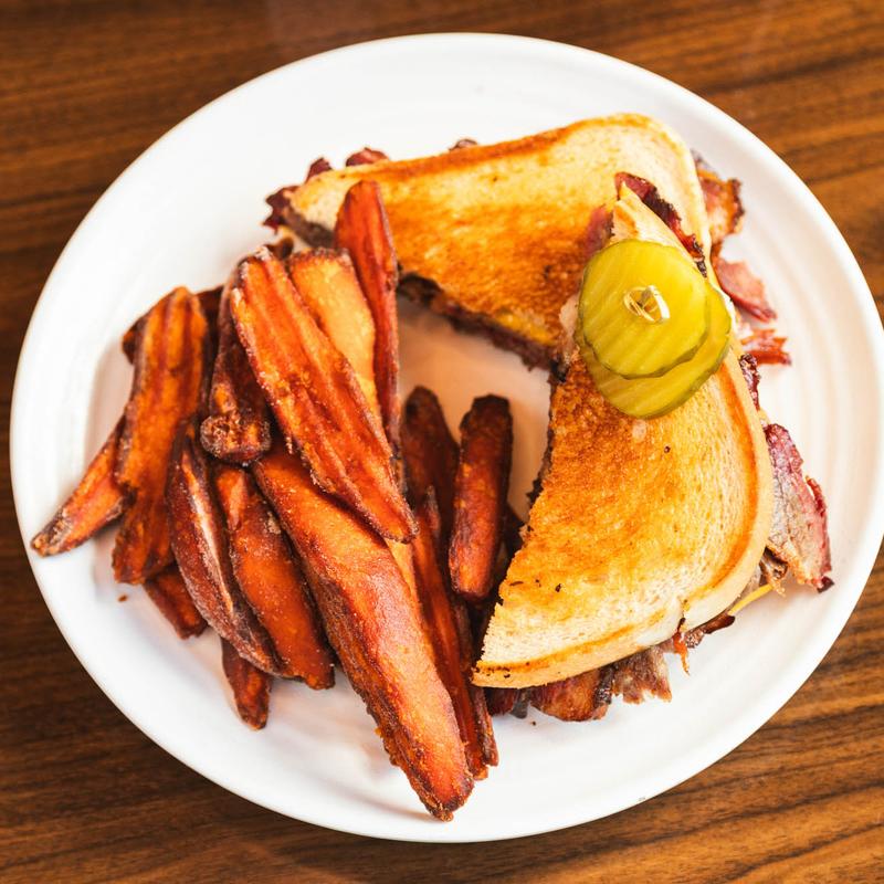 House Favorite | Beef brisket served on grilled sour dough bread with American cheese.